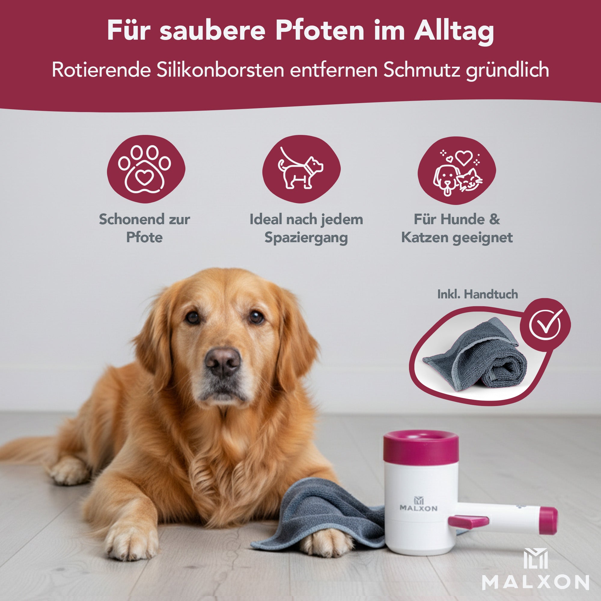 Halte dein Zuhause sauber und dein Haustier glücklich. Der MALXON Pfotenreiniger macht die Pflege einfach, schnell und sanft für mehr Wohlbefinden und weniger Stress im Alltag.